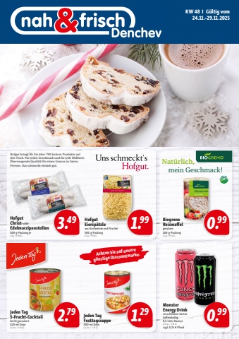 Hofgut bringt f%u00fcr Sie %u00fcber 700 leckere Produkte auf den Tisch. F%u00fcr jeden Geschmack und f%u00fcr jede Mahlzeit. %u00dcberzeugende Qualit%u00e4t f%u00fcr einen Genuss zu fairen Preisen. Das schmeckt einfach gut. Nat%u00fcrlich, mein Geschmack!Achten Sie auf unsere g%u00fcnstige Discountmarke.0.99 1.29 2.790.99 1.99 Hofgut Christ- oderEdelmarzipanstollen500-g-Packung je(1 kg = 6.98 %u20ac)Jeden Tag5-Frucht-Cocktailleicht gezuckert820-ml-Dose(1 Liter = 3.40 %u20ac)Hofgut Eiersp%u00e4tzleaus Hartweizen und Frischei500-g-Packung(1 kg = 3.98 %u20ac)Jeden TagFesttagssuppe400-ml-Dose(1 Liter = 3.23 %u20ac)BiogrenoReiswaffelgesalzen100-g-Packung(1 kg = 9.90 %u20ac)3.49MonsterEnergy Drinkverschiedene Sortenkoffeinhaltig0,5-Liter-Dose je(1 Liter = 1.98 %u20ac)zzgl. 0.25 %u20ac PfandKW 48 I G%u00fcltig vom 24.11.%u201329.11.2025KW48_Handzettel_Denchev_A4_LS.indd 1 10.11.25 10:03